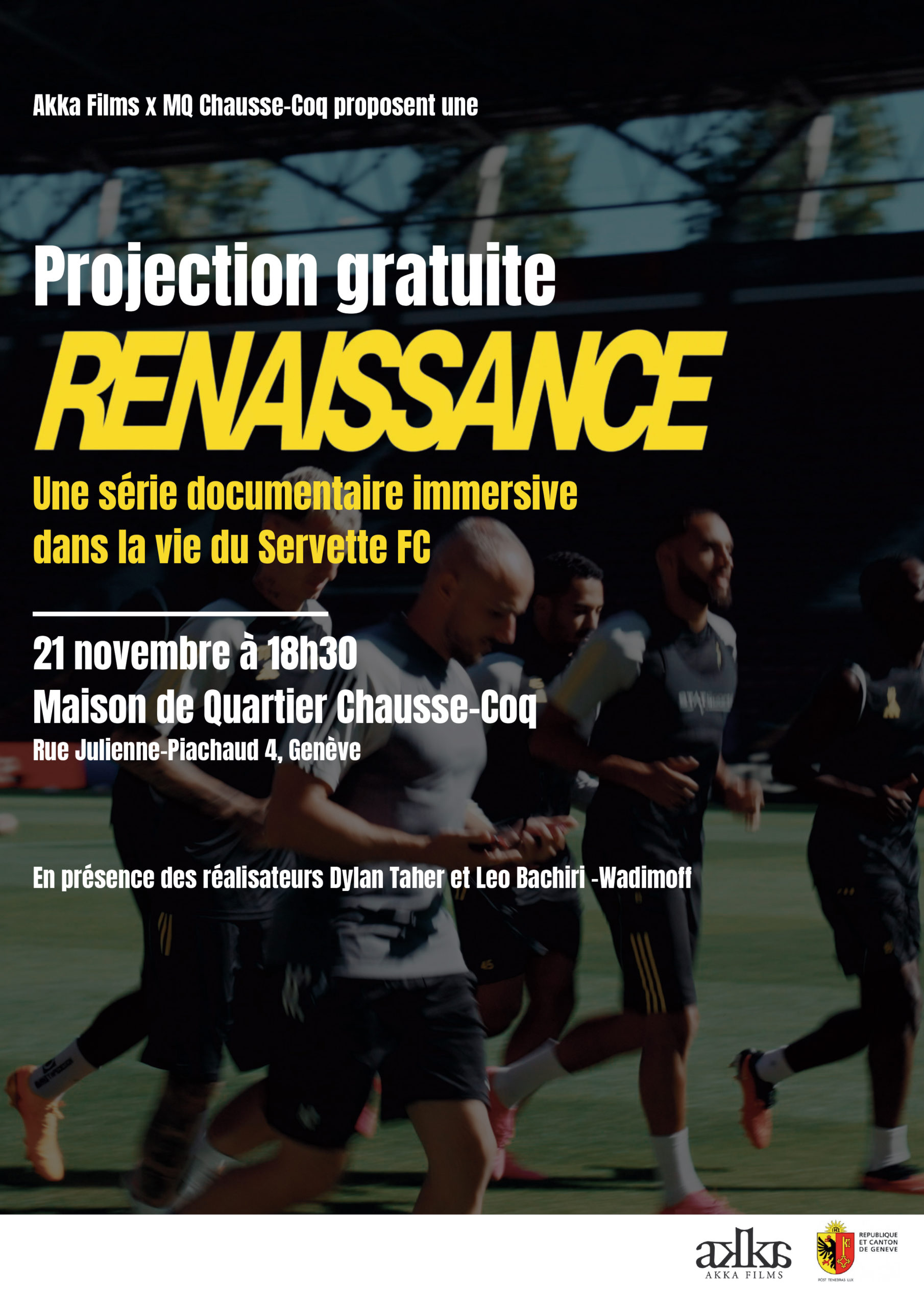 A l’occasion de la sortie sur le Servette FC « Renaissance », nous vous proposons une soirée projection ainsi qu’une table ronde en compagnie des deux réalisateurs : Dylan Taher et Léo Wadimoff.